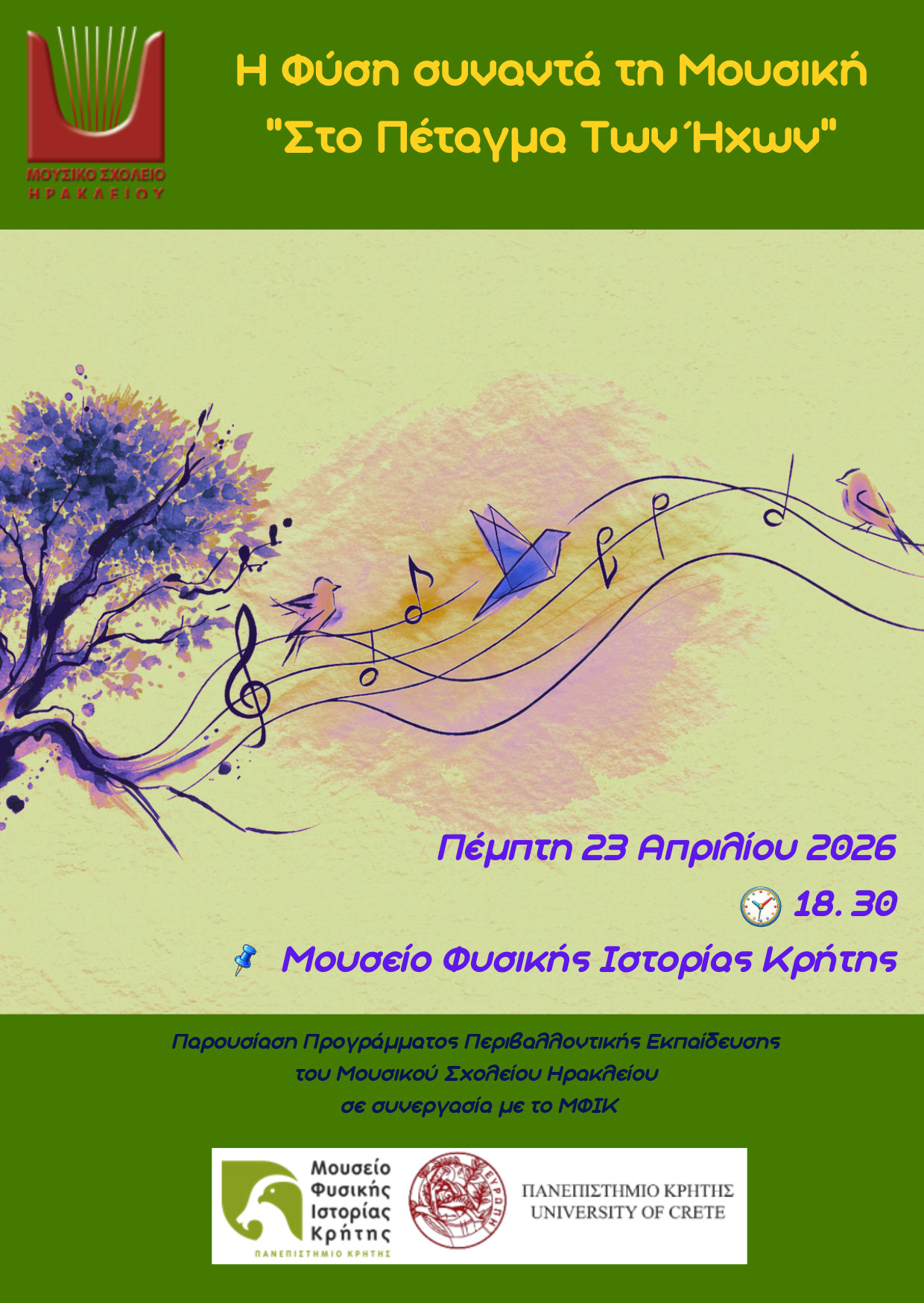 Το Μουσικό Σχολείο Ηρακλείου σε συνεργασία με το Μουσείο Φυσικής Ιστορίας Κρήτης-Πανεπιστήμιο Κρήτης, σας προσκαλεί στην παρουσίαση του Περιβαλλοντικού Προγράμματος "Στο Πέταγμα Των Ήχων" την Πέμπτη 23/4/2026, στις 18:30.